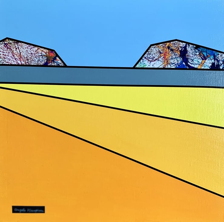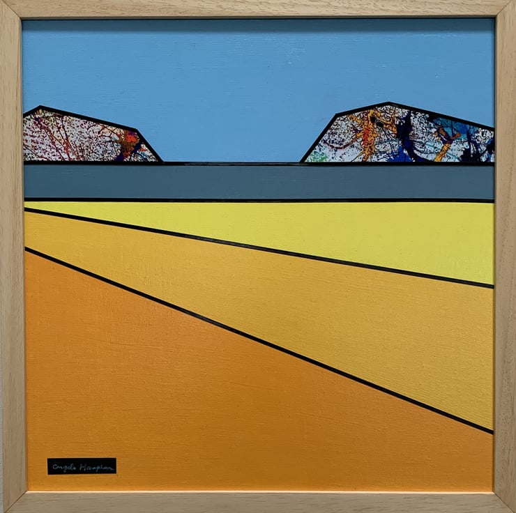 Framed acrylic mixed media painting titled Bright Seascape. This framed painting on canvas has collaged hills using ink blown fragments, and gridding tape. The beech frame has been lightly waxed.