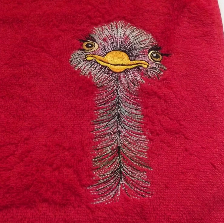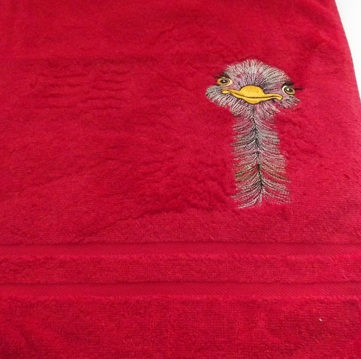 Machine Embroidered by me. Ostrich design machine embroidered Bath Towel. Dark red. Towel measures 70cm x 137cm. 100% Turkish Cotton. t16