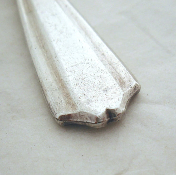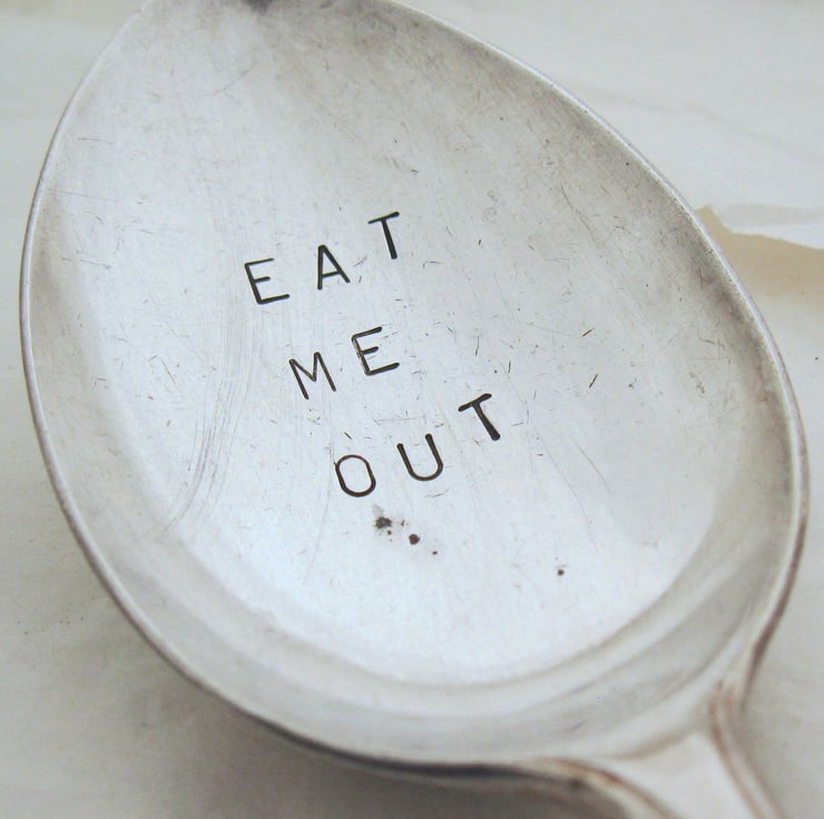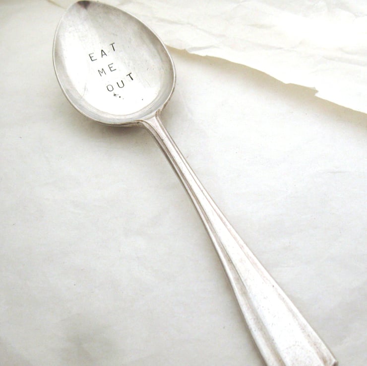 A rather rude handstamped vintage silver-plated dessert spoon with the words 'EAT ME OUT' in the bowl. Rendered a whole lot ruder by the somewhat unfortunate design of the handle. Either the designer was simply a product of more innocent times and had never encountered the term 'camel toe,' or someone was having a laugh... it even looks as though it's wearing knickers on the reverse... anyway I hope it will amuse you, or someone you know who has THAT sort of sense of humour!