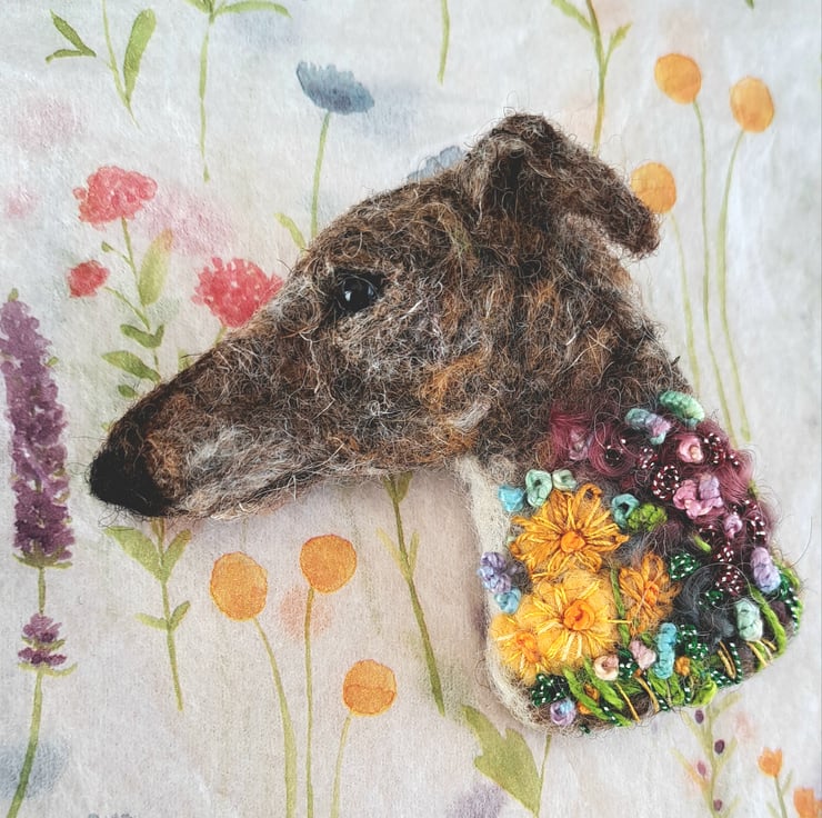 needle felted greyhound brooch,with embroidered details,approx 3 inches,metal brooch fitting to rear