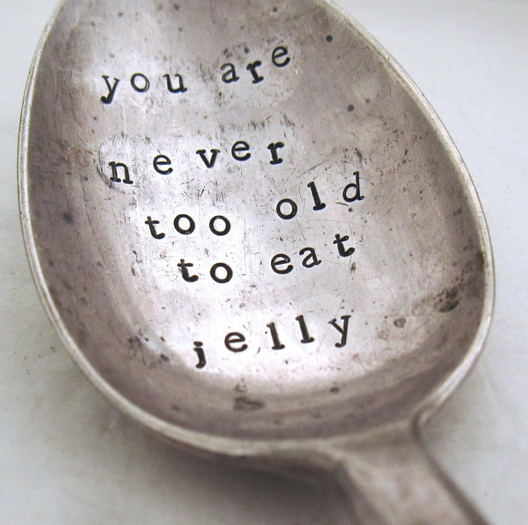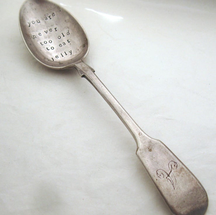 Another addition to my Growing Old Disgracefully collection: a hand stamped antique silverplated dessert spoon with an original 'A' monogram on the handle, to which I've added the words 'you are never too old to eat jelly' in suitably wobbly lettering in the bowl. I hope this will bring a smile to someone you know who's growing older but not necessarily growing up!