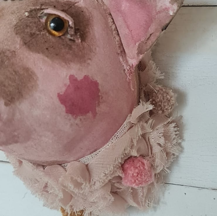 This sweet little piece is made from unbleached cotton. Hand stained and painted for an aged vintage look. A fabric rose ruffle peppered with little wool pom poms. On his head sits a little rusted metal crown. He is mounted on wood with a metal D ring for ease of hanging.