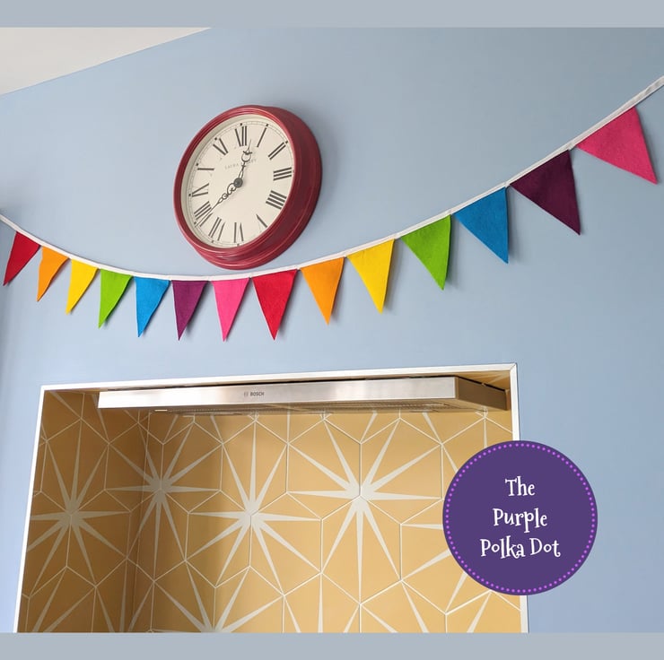 I made this bunting to complement the rainbow happy birthday bunting so that you can extend the celebratory vibe in a bigger space but also to use year round for those that like a bright colour pop in their home.