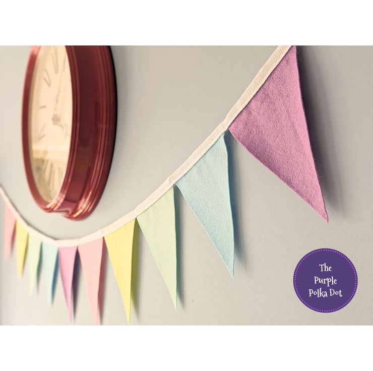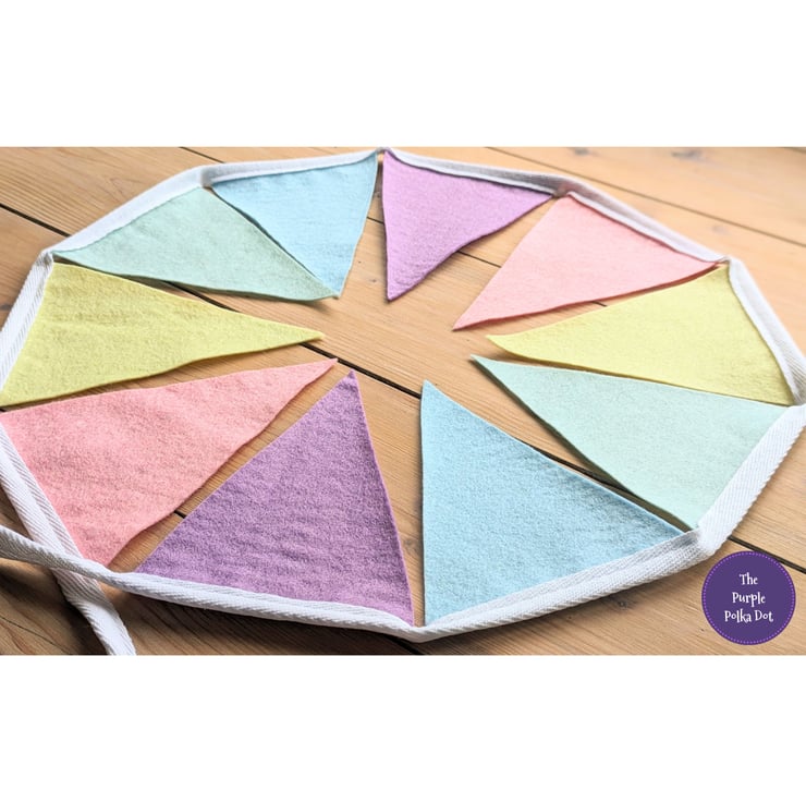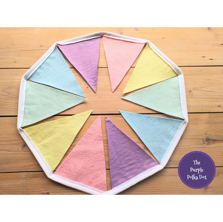 A more subtle version of the bright rainbow bunting for those that prefer a softer pastel colourway. This bunting features 10 flags in 5 pastel colours of sumptuously soft 40% premium wool blend felt: