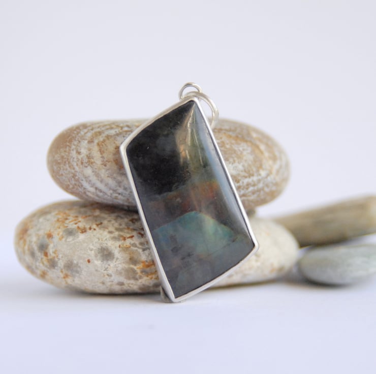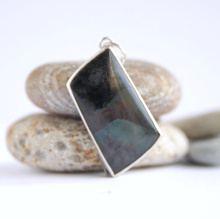 This pendant features a rhomboid shaped piece of spectrolite which has been smoothly bezel set in sterling silver and finished off with a simple loop bail at one corner. Spectrolite is related to labradorite and displays the same flashes of colour, in this piece they are blue and browny purple (similar to mahogany), but whilst labradorite has a grey or brown back ground colour, spectrolite has a black/ dark grey back ground. The flash of colours against the black reminds me of the northern lights against the midnight sky but in this piece the flash is at the bottom whilst the top section is just black. It displays might more flash in person than I've managed to capture in my photos. Spectrolite is only found in one part of Finland where the mining season is fairly short due to the cold weather, I bought the rough that this cabochon was cut from whilst visiting Finland and then had it custom cut back in the UK.