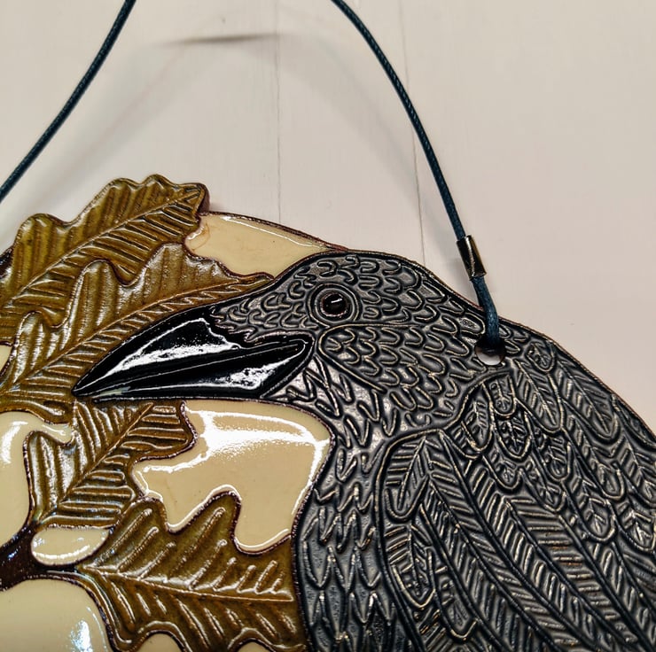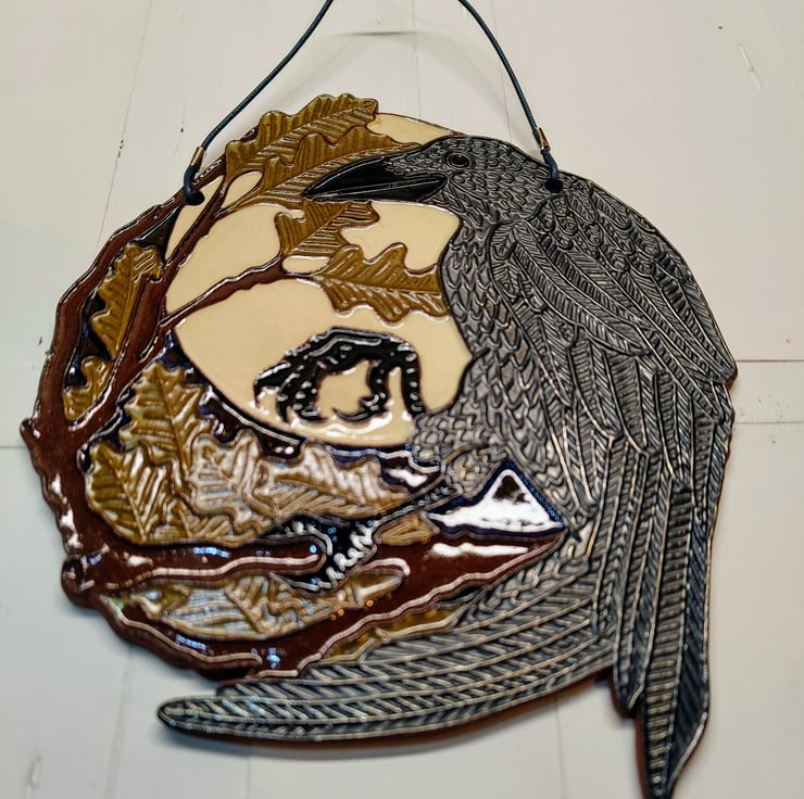 Ceramic hanging plaque depicting a crow sitting in an oak tree with the full moon in the background. The plaque is made from a dark red clay which is rolled out and then printed with my own design. I have then used different coloured glazes to highlight the design. it has a dark blue cord securely attached so that it can be hung on a wall.