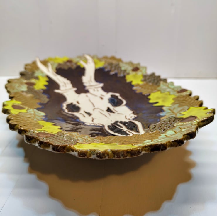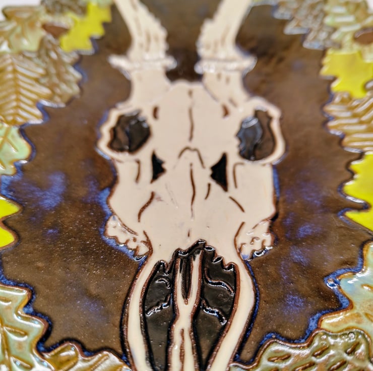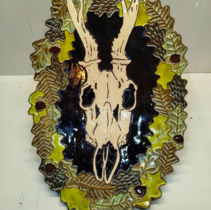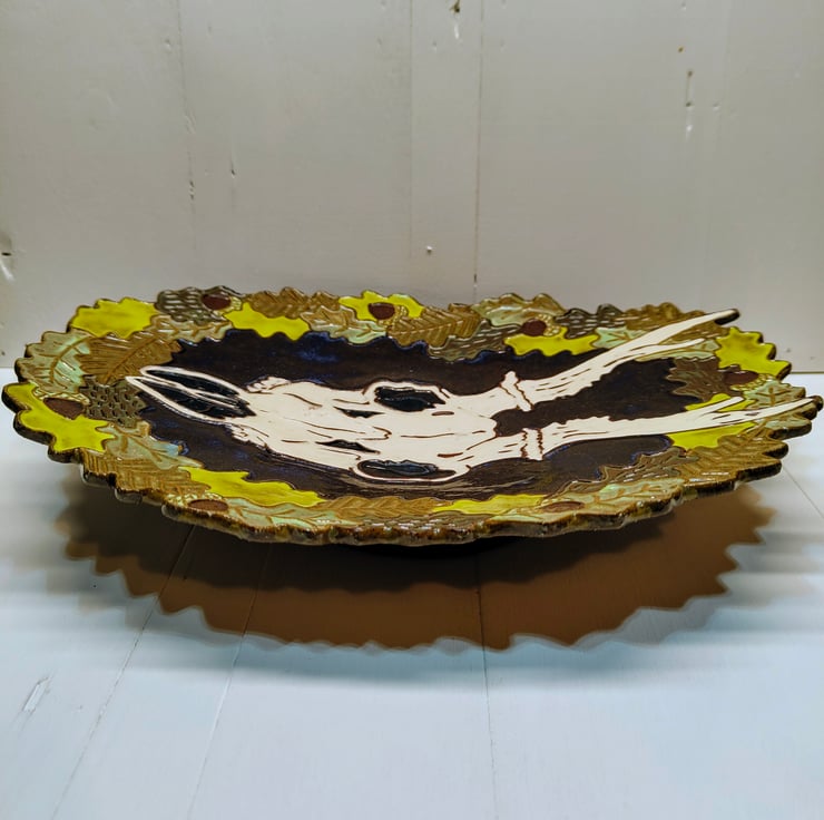 Shallow dish with a a roe deer skull surrounded by a wreath of oak leaves. It is raised on a circular foot. The design is in relief with coloured glaze added in greens, blue and white. The glazes are non toxic and food safe.