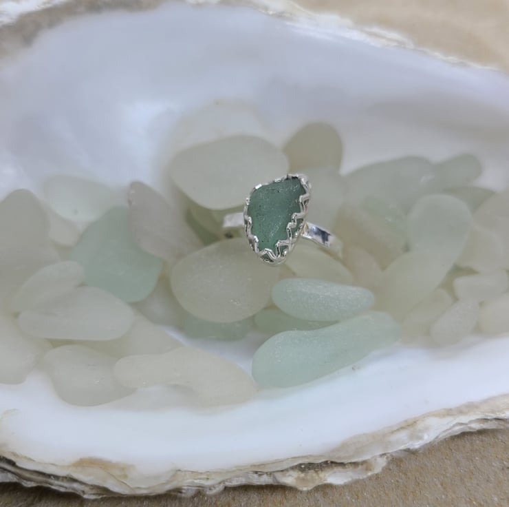 A piece of genuine UK sea glass (pale sage green) set in fine silver on a sterling silver hammered band.