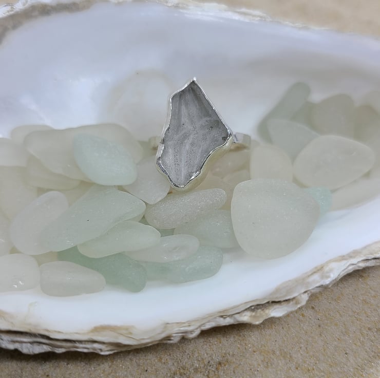 A piece of genuine UK sea glass (warm grey) set in fine silver on a sterling silver hammered band.