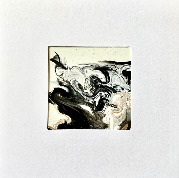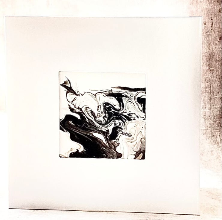 More than just a card—this is a small, original artwork. A striking abstract acrylic pour in black, white, and shimmering gold is hand-painted on watercolour paper and set within a white aperture card, creating a refined, gallery-style presentation.