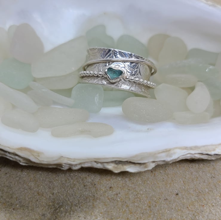 A piece of genuine UK sea glass (light teal blue)) set in fine silver on a sterling silver bobble band, wothe a plain band all on a wide textured band.