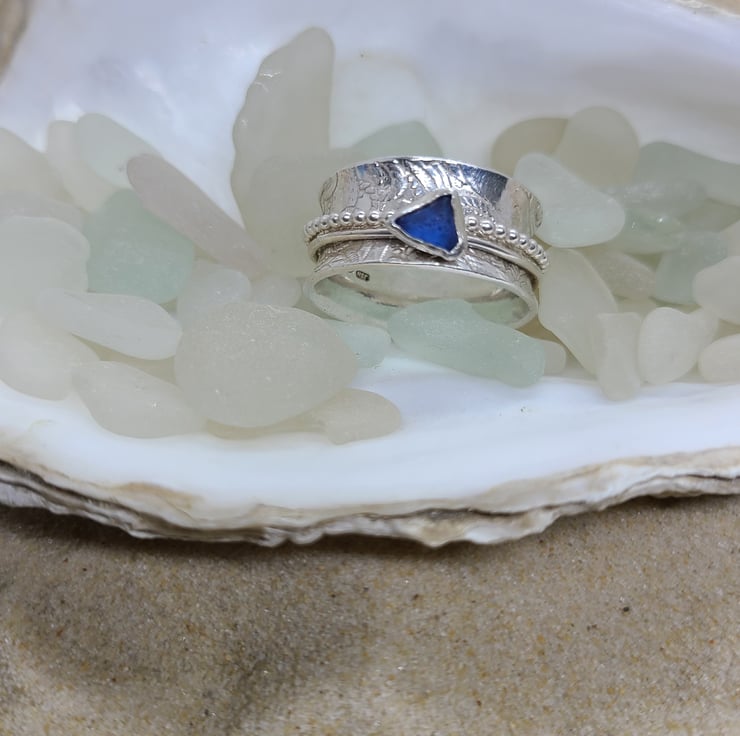 A piece of genuine UK sea glass (cobalt blue) set in fine silver on a sterling silver bobble band, with a plain band all on a wide textured sterling silver band.