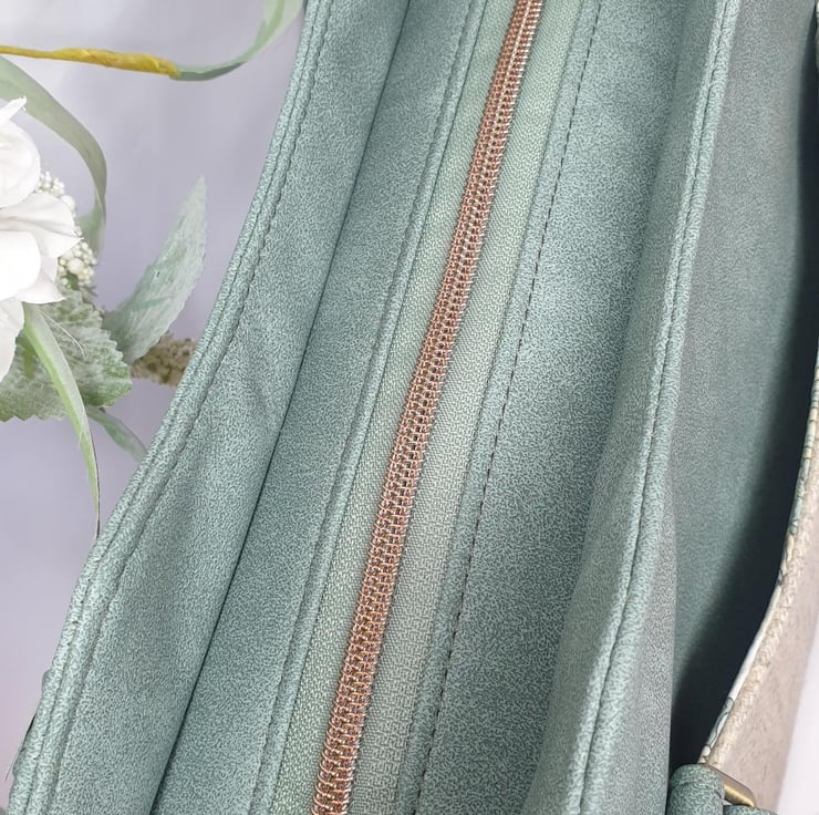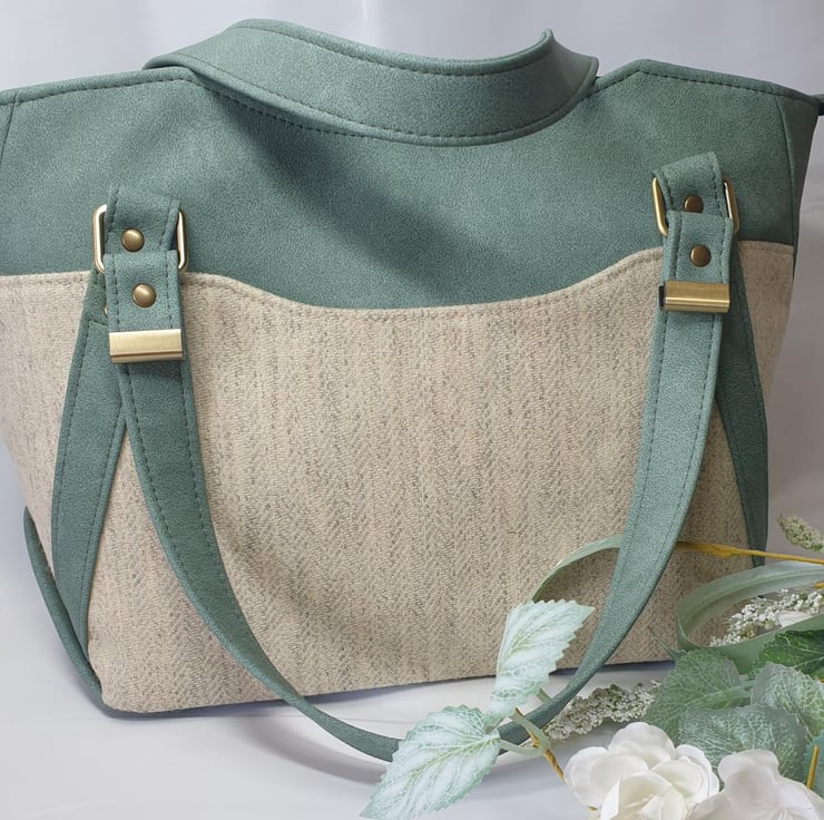 Welcome to the Hiraeth handbag in Yorkshire tweed herringbone and Mora luxury faux leather. The Oatmeal herringbone is a cream and very pale grey weave and the beautifully soft Mora faux leather is in smokey green.