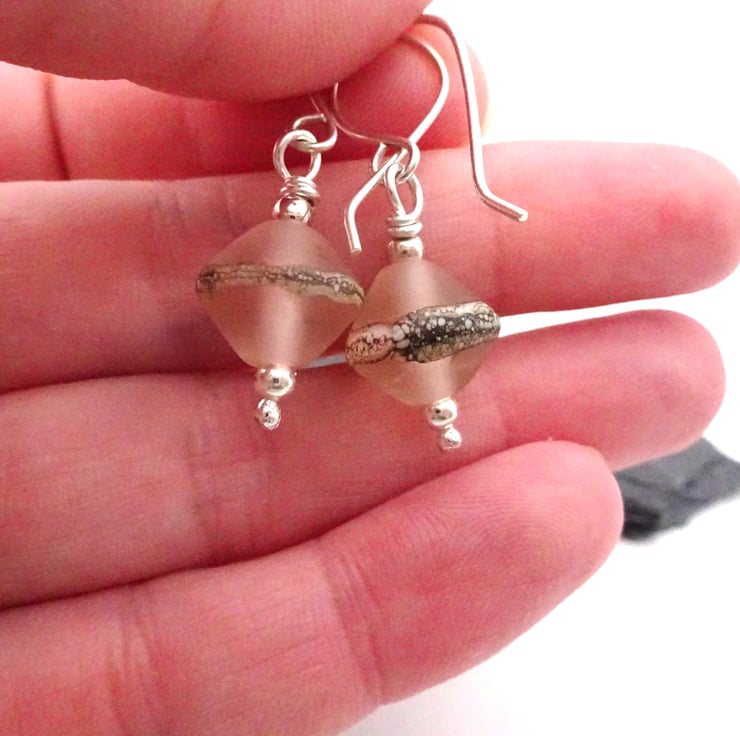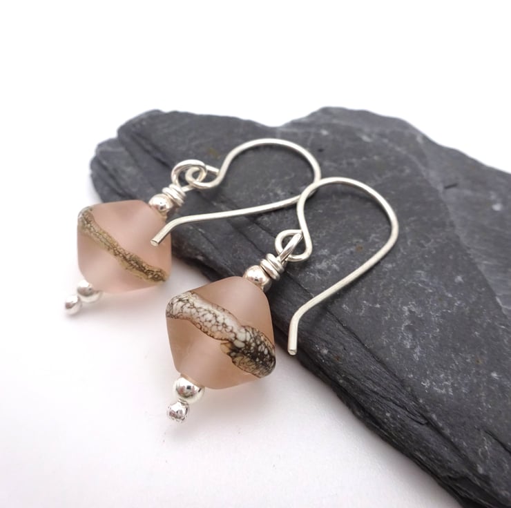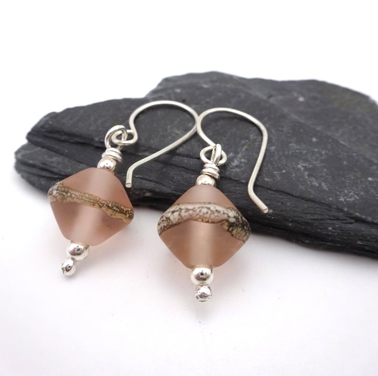 A pair of earrings made with handmade sterling silver ear wires and handmade lampwork peach glass beads.
