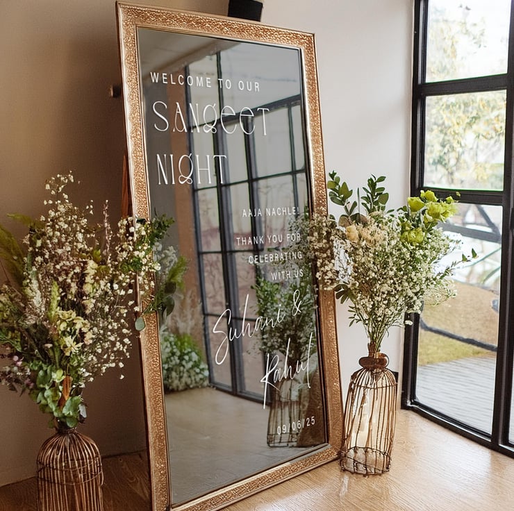 Welcome your guests in style with this bold and modern Sangeet Night vinyl sticker — featuring playful typography, elegant script names, and the fun phrase “Aaja Nachle!”. This clean, contemporary decal is ideal for minimalist mirror setups and stylish pre-wedding vibes.