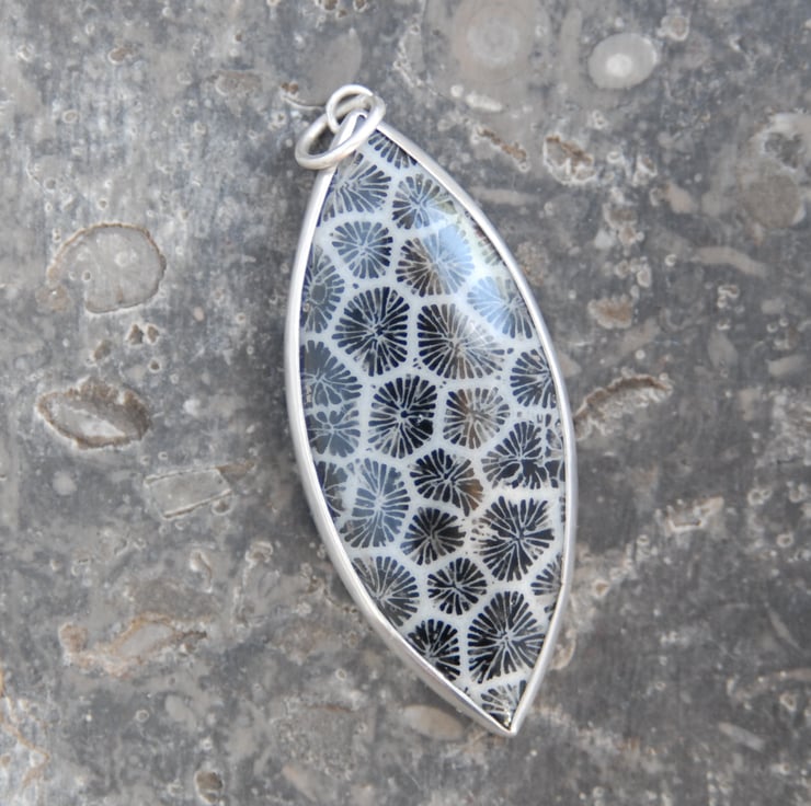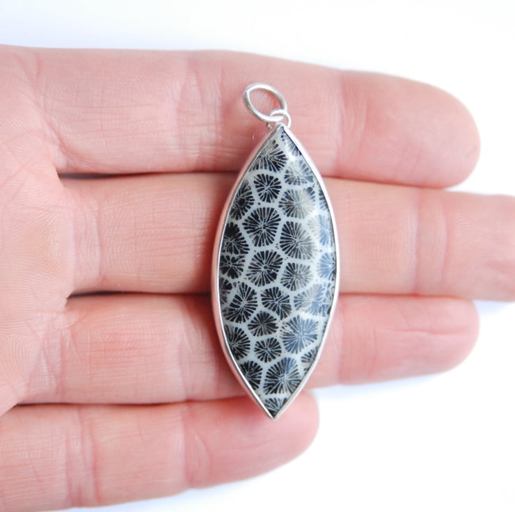 This pendant features an intricately patterned piece of fossilised coral which has been bezel set in sterling silver and finished with a (generously sized) simple loop bail. The fossilised coral has a black flower like pattern on a pale grey ground, although it wasn't sold to me as having gone through any sort of colour enhancement I suspect it has been bleached and then dyed to make the pattern stand out more.The pendant has a leaf or marquise shape and comes complete with a sterling silver chain but the bail could easily fit a ribbon or cord if you wanted to swap it over.