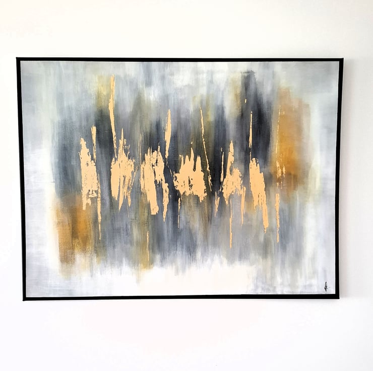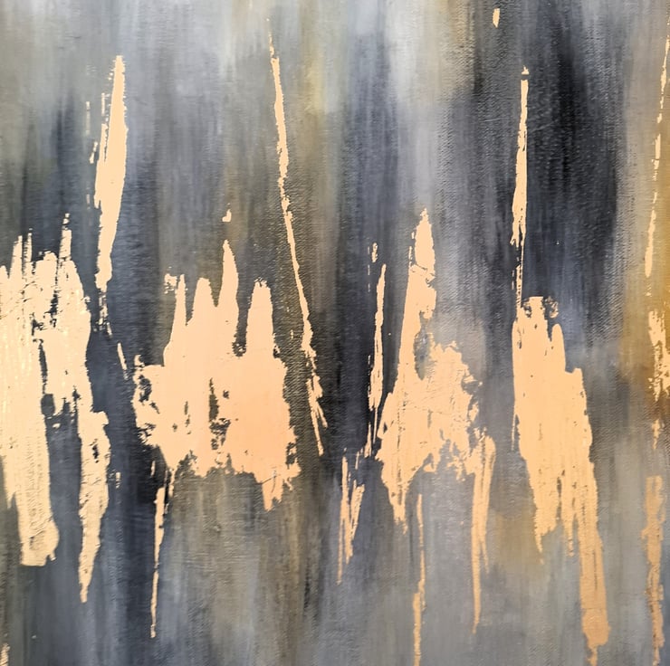 I began by painting the canvas in titanium white and added various dots of paynes grey which I blended carefully. I then began layering yellow ochre and paynes grey to achieve a random but blended combination of the colours. I painted a paynes grey border around the canvas to finish the painting. Having looked at the painting a few times I decided that it was missing something so I applied gold foil in selected areas and I feel it brings the artwork to life, especially as the light dances across the gold. Beautiful!