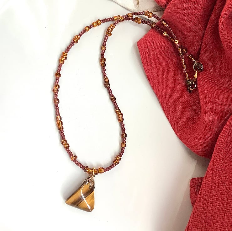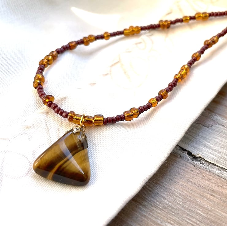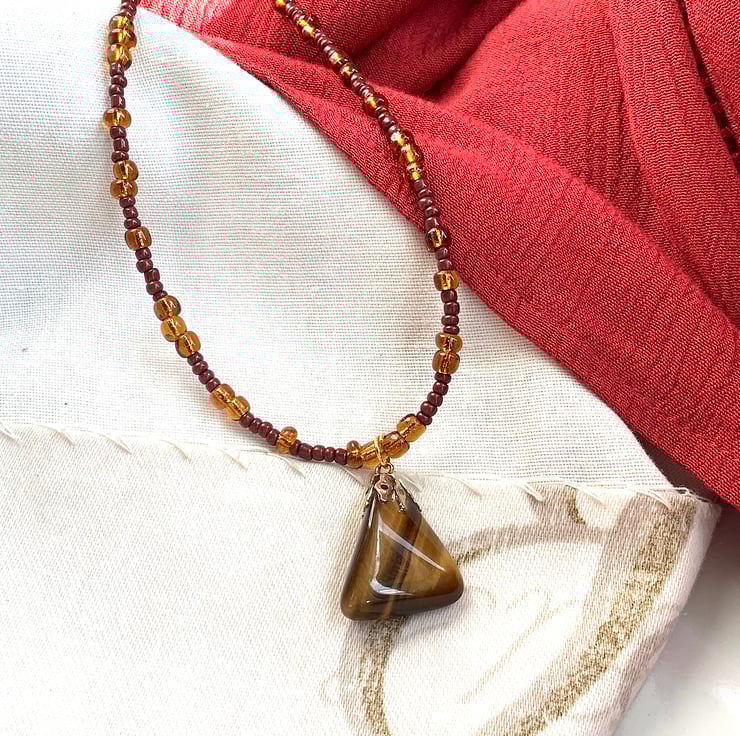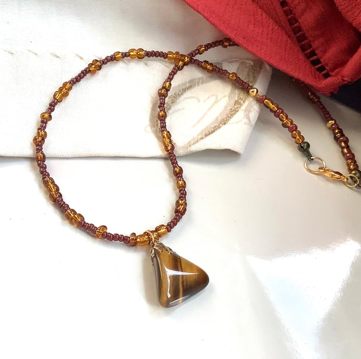 Very pretty single strand necklace in earthy brown and ochre colours with beautiful tiger eye pendant. I got this pendant in a market stall; it has this lovely vintage look. The necklace is made with a mix of new and old beads. 45 cm length