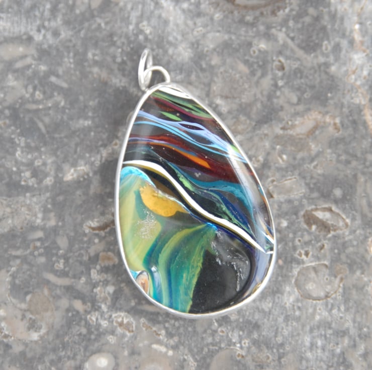 Surfite is cured epoxy resin waste that builds up during surfboard manufacture, during the glassing stage the excess resin is drained off the board and into a bucket. This pendant shows off the wide range of colours of surfboard that people choose to have made featuring a mix of black, white, lilac, red, blue and clear. One section has wavey lines theother section is more marbled. Because Toy Factory Surf (the people in Newquay I bought the rough block of surfite from) weren't expecting anyone to want their waste resin they chucked the odd bit of rubbish in there, there is a fragment of a rim from a paper cup just visible on the edge of the pendant.