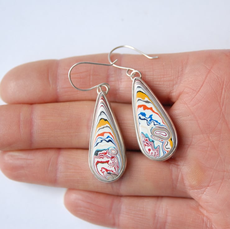 These elongated drop earrings feature fordite which has been bezel set in sterling silver and finished with simple silver hooks. The fordite is predominately white with yellow and red swirls with a little silver and royal blue, the fordite still has a little texture from the original dimpled surface of the 'rough' (its not actually rough, I've polished out all the rough edges). They measure 53mm (from top of hook) by 15mm across, fordite is lightweight so comfortable to wear all day.