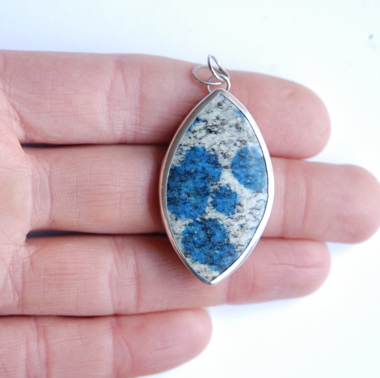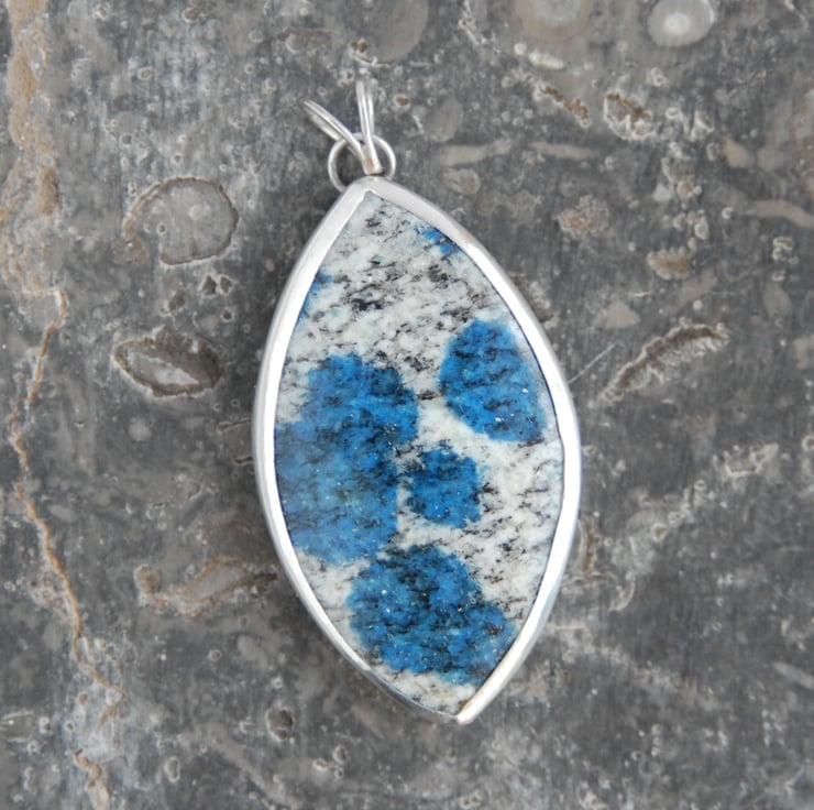 This pendant features a bezel set cabochon of unusual K2 jasper, K2 jasper gets its name from the location it is found in - the foothills of Mount K2 - and has a unique colour palette of blue spots on a pale grey background. This particular piece is leaf shaped and bezel set in an open backed sterling silver setting, comes complete with an 18 inch sterling silver chain but the bail could fit a cotton cord if you wanted to swap it over. The blue spots are a natural formation on the grey granite back ground, when it was first discovered people thought the dots were dyed but analysis showed that it is azurite. The origins of this material would make a great gift for the adventurer in your life or someone who loves climbing.