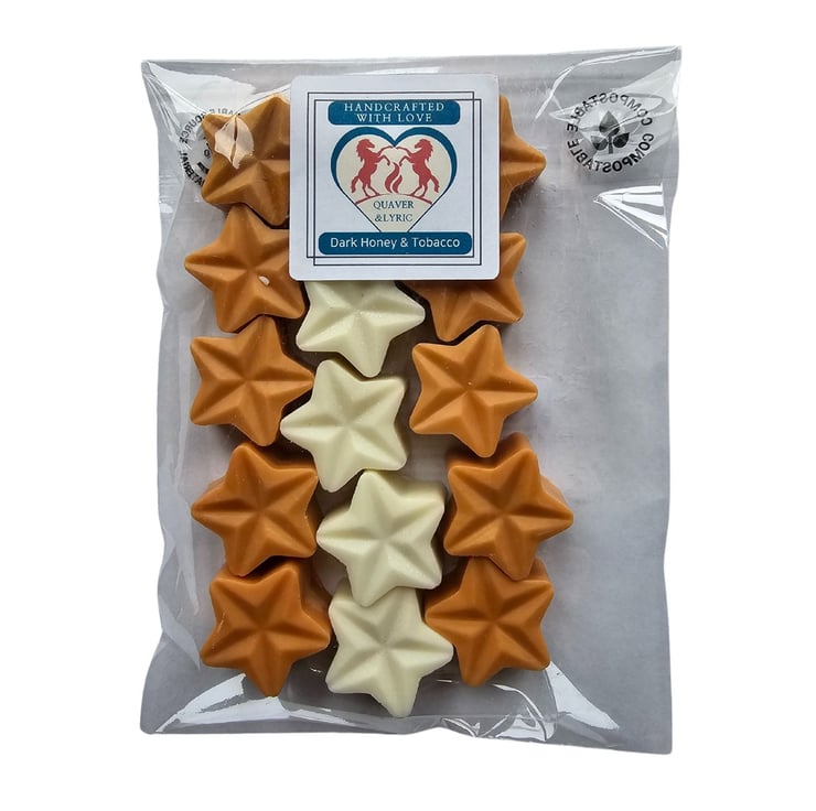 15 Star-shaped soy wax melts. Handcrafted in the UK with the finest vegan, responsibly sourced soy wax and Dark Honey and Tobacco: a rich sweet earthy fragrance with top notes of honey, spices, citrus and tobacco with notes of sandalwood. Each melt star provides a fragrance that will linger for over 5 hours.