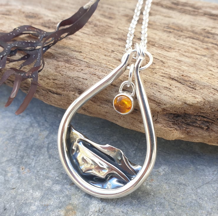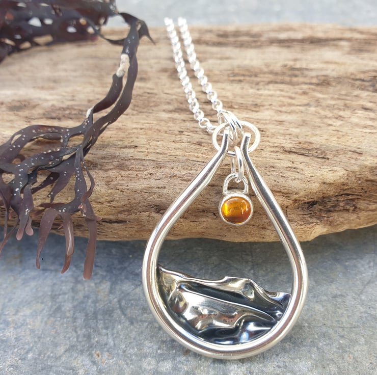 This unusual pendant is perfect for anyone who loves the great outdoors, wild swimming, watersports or just enjoys beach walks. The sterling silver open teardrop shape is formed from chunky 3mm round wire and has a layer of fine silver which has been folded to create the wave like texture. A 6mm amber cabochon, set in silver, has been added to depict the sun and hangs freely from the top. Measuring approx 44mm long and 32mm across it hangs from a sterling silver belcher chain which fastens with a bolt clasp.