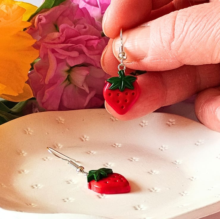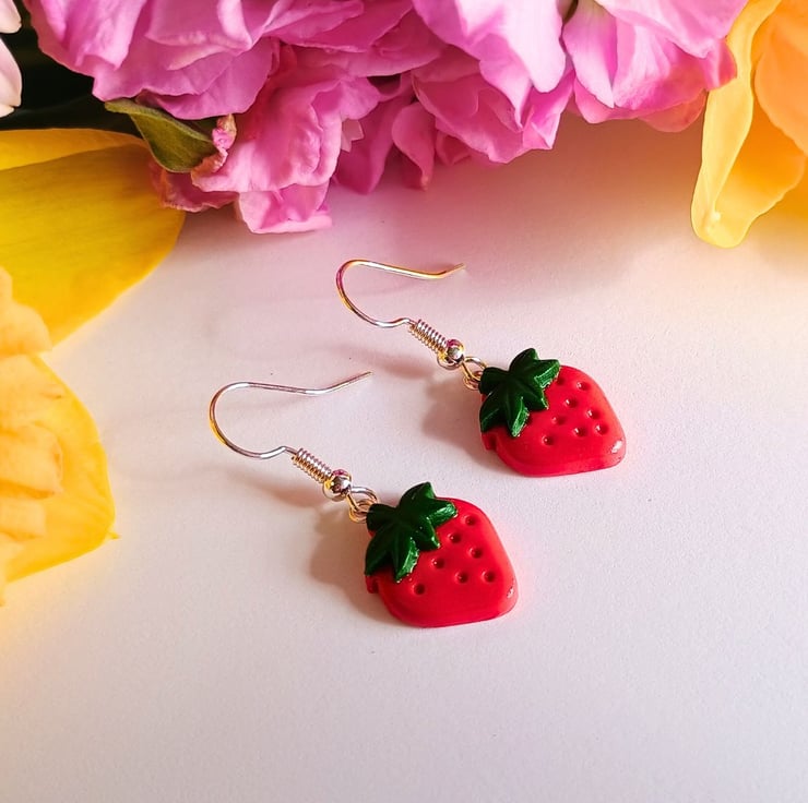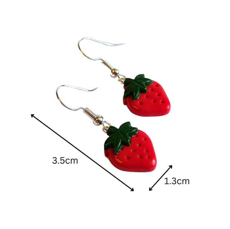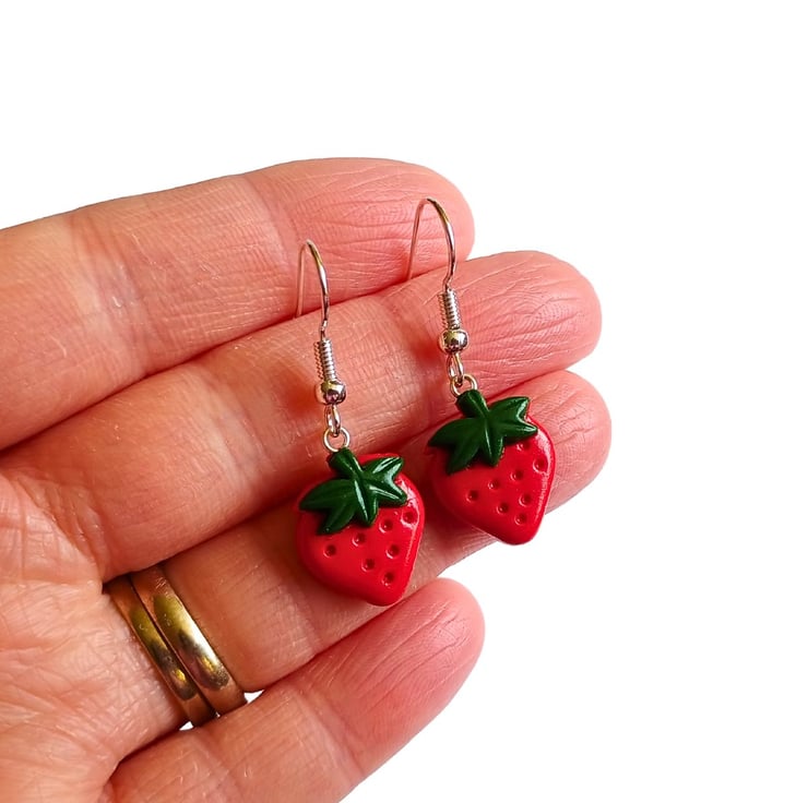 These cute strawberry earrings have been handmade from polymer clay and feature red strawberries with green leaves and stem. The earrings are finished with two coats of gloss varnish to enhance the colours and are finished with silver plated earring wires.
