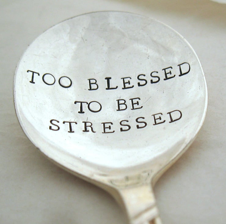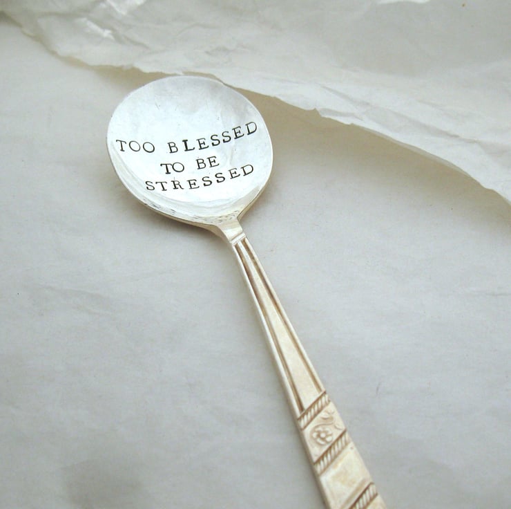 A handstamped vintage spoon with the words 'TOO BLESSED TO BE STRESSED' on it. Perfect for reminding yourself to take a deep breath and count your blessings every now and then.