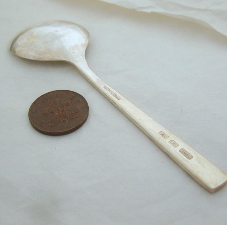 It's a vintage silver-plated fruit/dessert spoon with a floral patterned handle and is approx. 14cm long. The lettering is coloured with a waterbased, non-toxic acrylic ink. Wash by hand with care. Please note this is a vintage spoon so it does have a few wear marks and some residual tarnish (possibly removeable by further polishing). Just so you know!