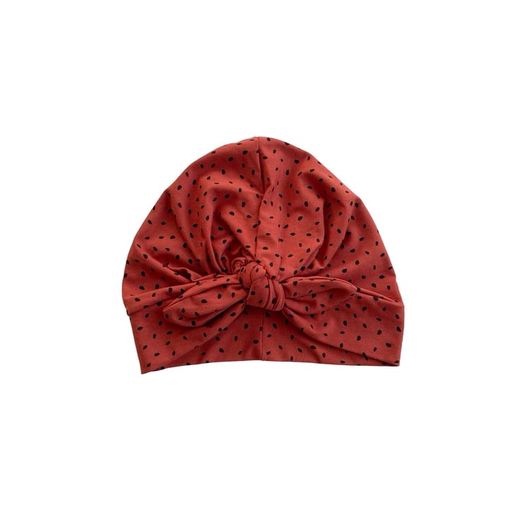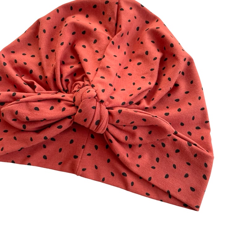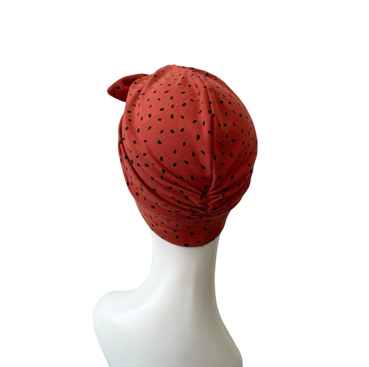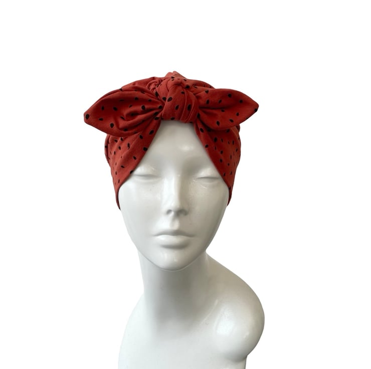 Vintage inspired 1940s 1950s style rust stretch jersey turban hat with a bow