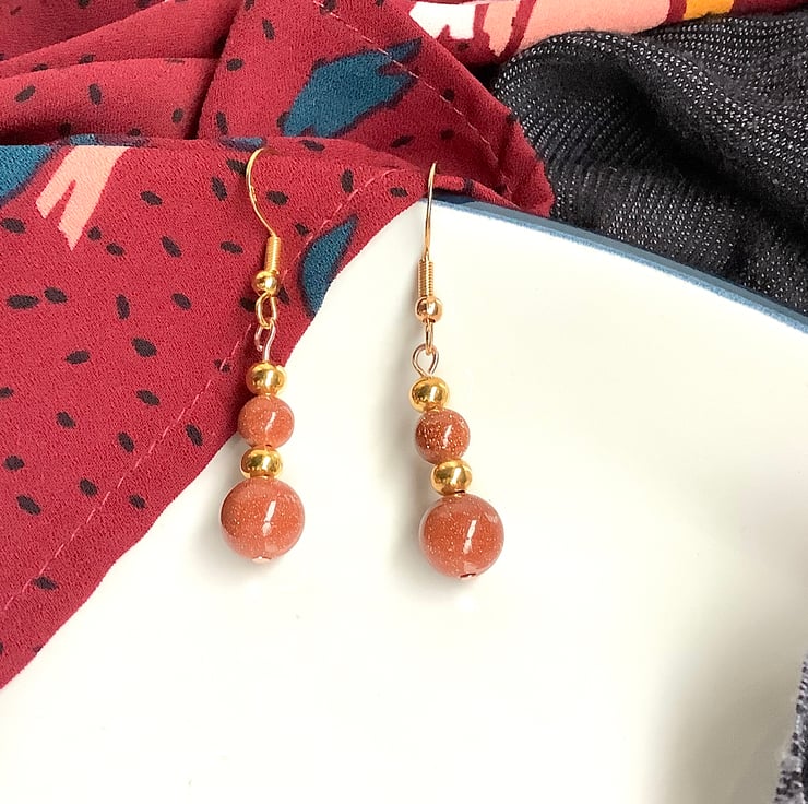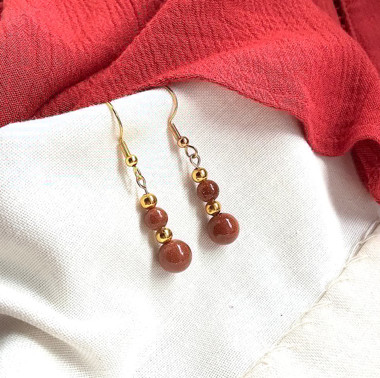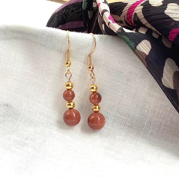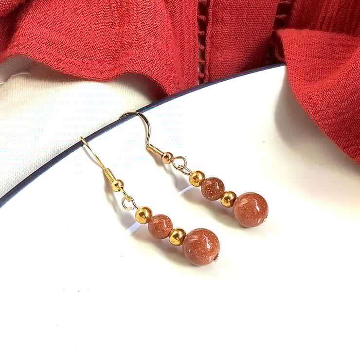 Goldstone beads, gold effect spacer beads, dangling lightweight earrings