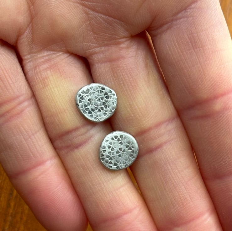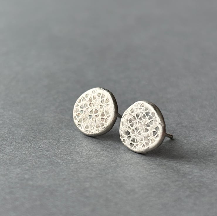 Perfect for everyday wear these cute little studs are made from recycled silver. They have an abstract pattern stamped into the surface and I’ve oxidised them to make the pattern stand out. Please note each pair may vary slightly from the image as each pair are completely handmade.