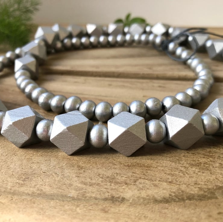 A metallic silver wooden bead necklace with 12mm silver wooden hexagon beads and 8mm silver round wooden beads.
