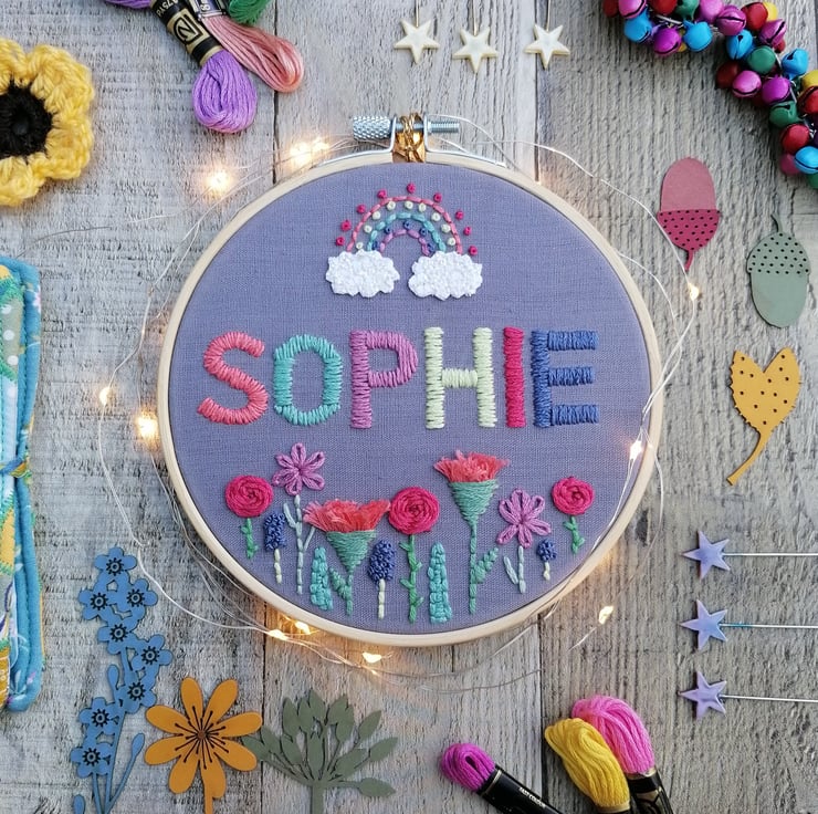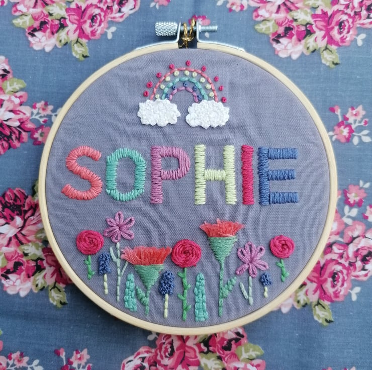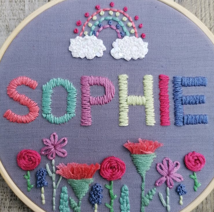 A personalised hand embroidered art work, in a 14cm wooden hoop, adorned with gold thread for hanging. Decorated with embroidered flowers, a rainbow and sparkling sequin fabric clouds.