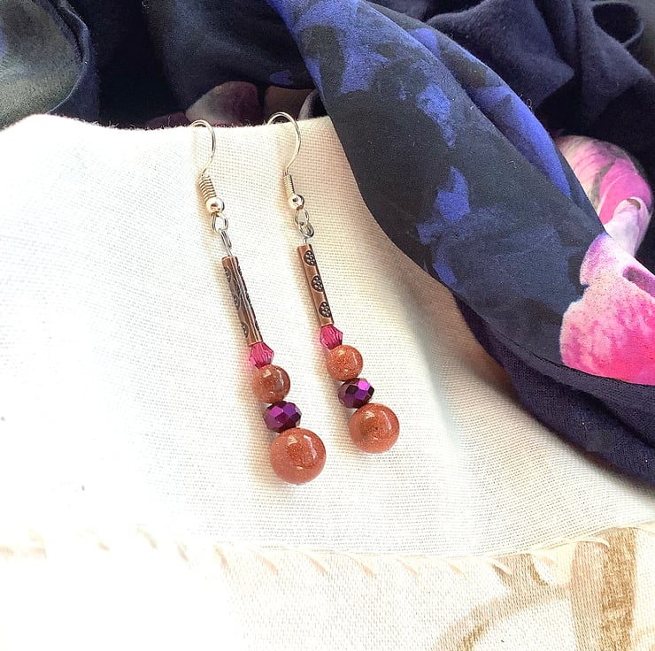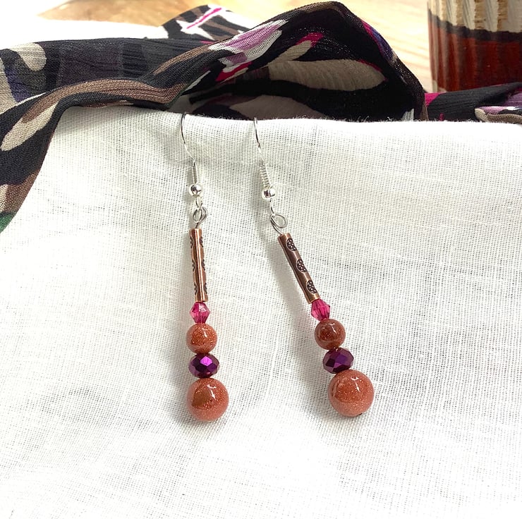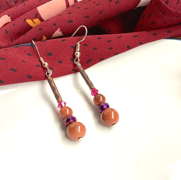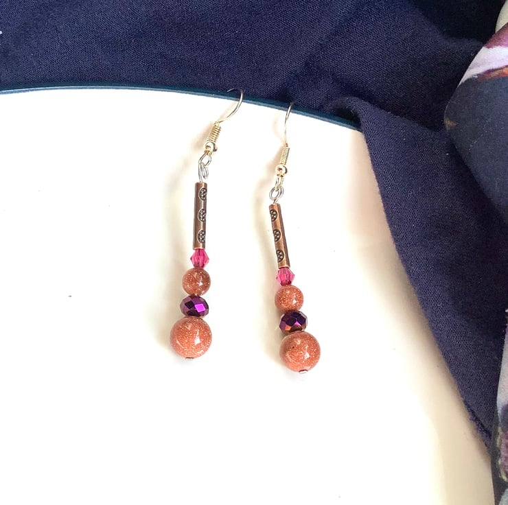Rustic boho chic earrings: a combination of sandstone, crystal beads and long tubular copper effect beads. Dangling lightweight earrings. 5.7 cm length
