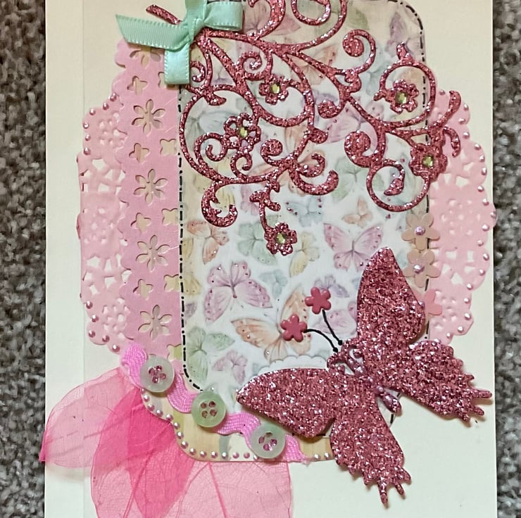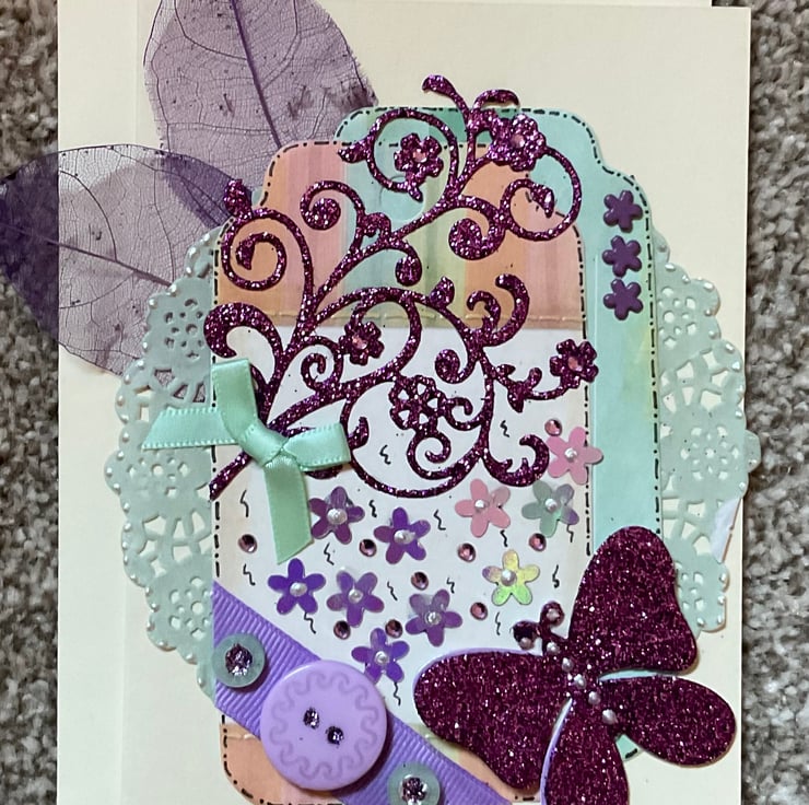 A hand crafted greetings card with a butterfly floral theme. Envelope provided. I only have two of these cards.lone pink and one purple. Please state your preference.