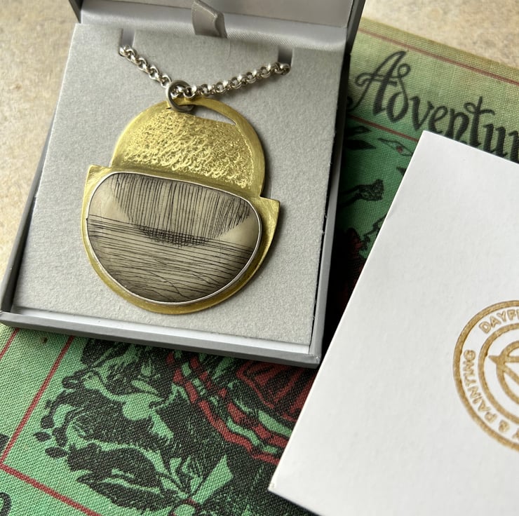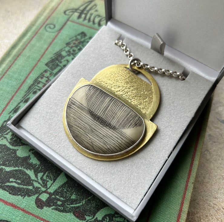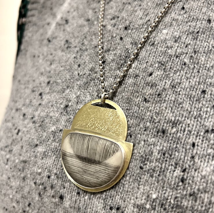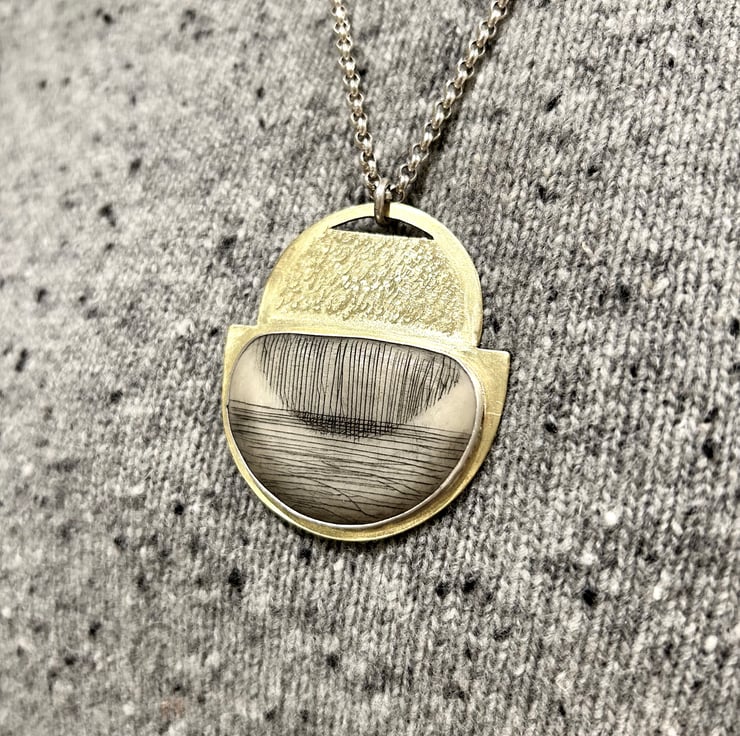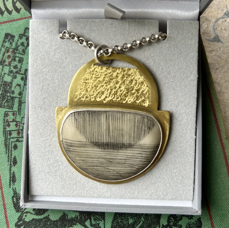 Hand sawn pendant with bezel set Tagua Nut that has a Scrimshaw illustration of the setting sun.
