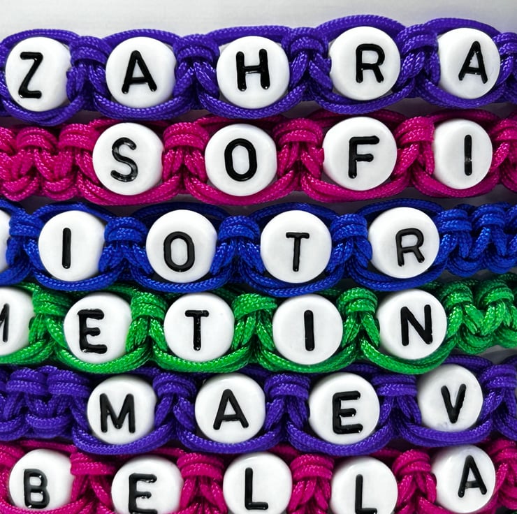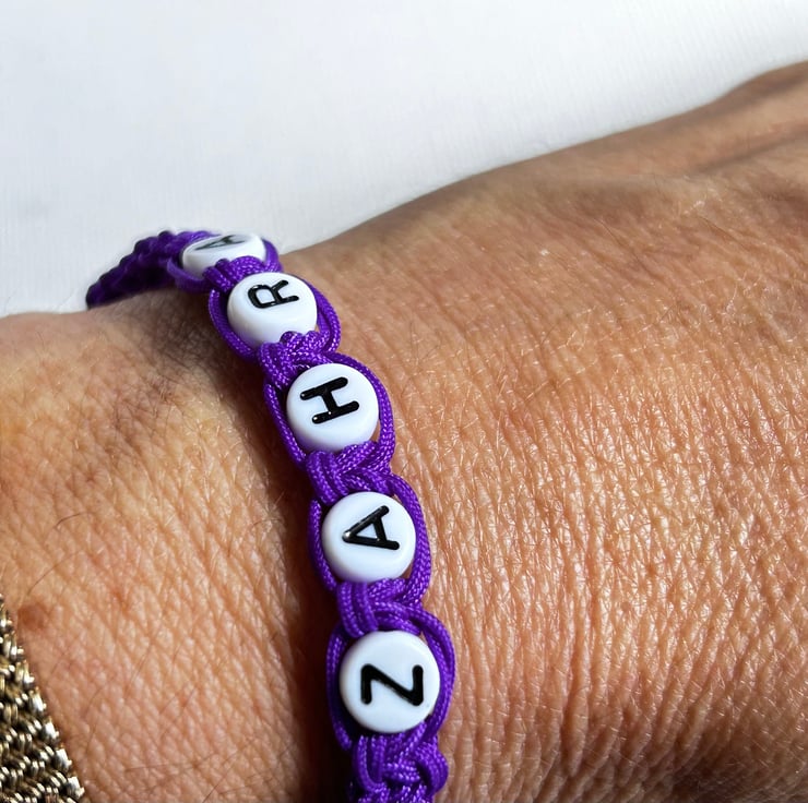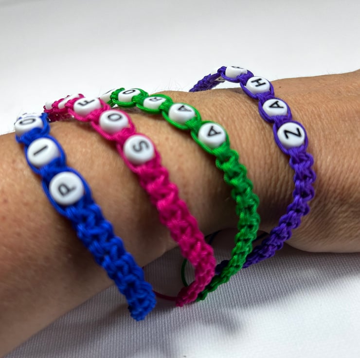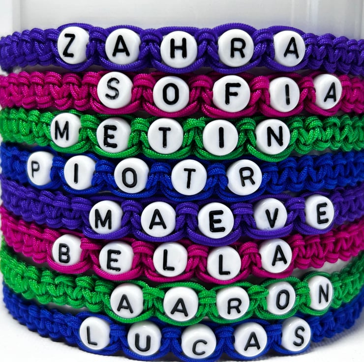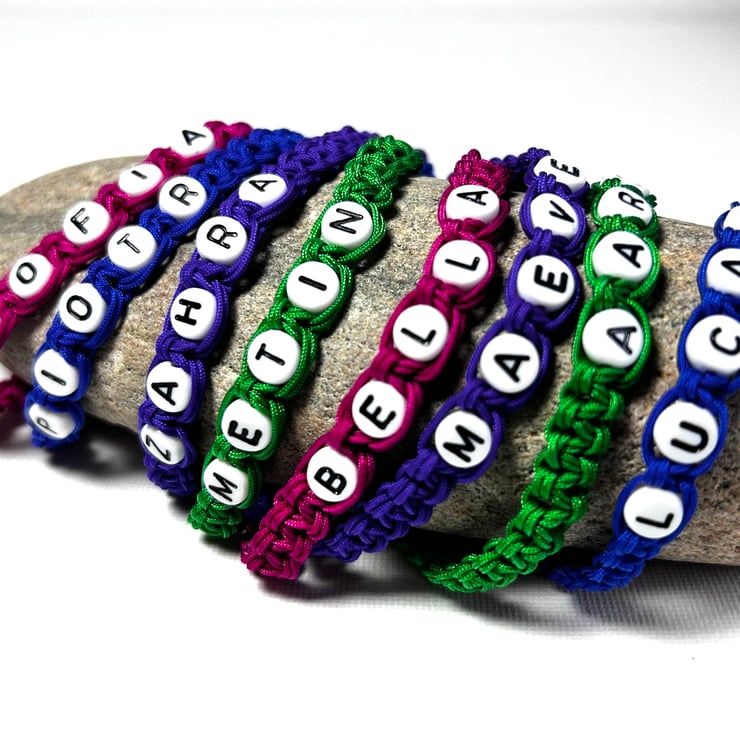 Fun colourful personalised bracelets. These bracelets are handwoven to order in fun colours. Choose from bright pink, green, blue or purple.
