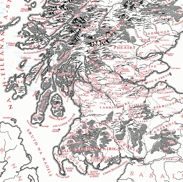 Contains detail of prominent physical geography and major towns spanning through the Highlands, Lowlands and Islands, inspired by Tolkien's fold-out maps of Middle Earth featured in the books The Lord of the Rings and The Hobbit.
