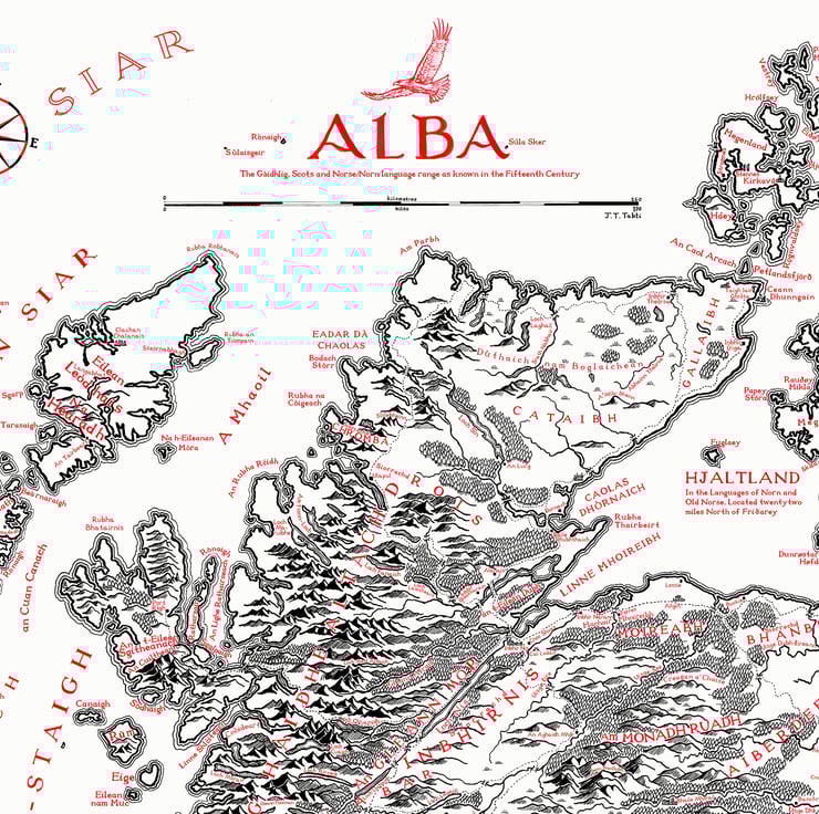 Following the English version of my Scotland map I made in December, I was keen to make a Gàidhlig version. I soon discovered that Gàidhlig wasn't the only popular language used in Scotland's vast history after finding a language map of 15th Century Scotland, with Norn/Norse use in Northern Isles and Scots influence spreading from the Borders and North East. Naturally, Scots and Gàidhlig in particular did have increasing overlap over the 1400s which became a fun challenge to research to create a map as accurate as it could be.