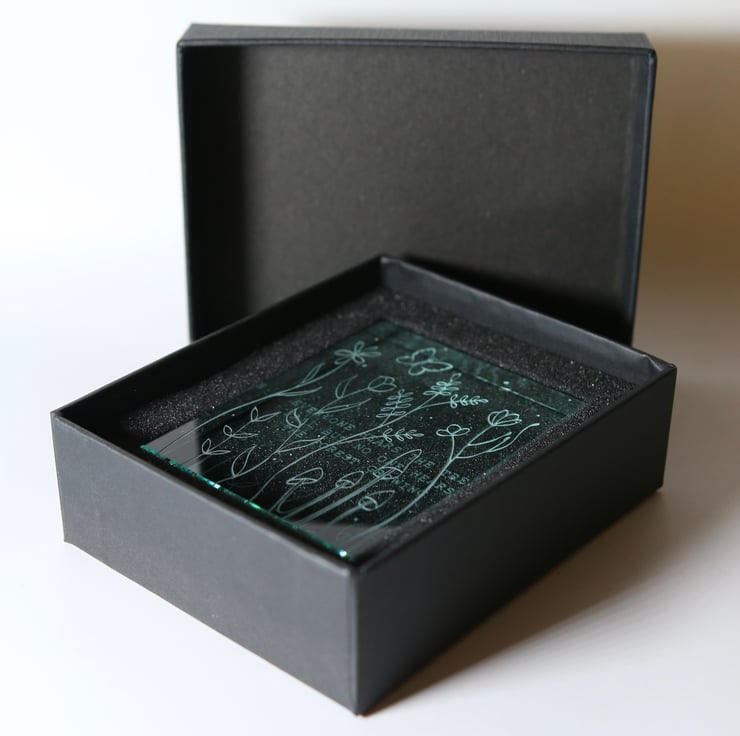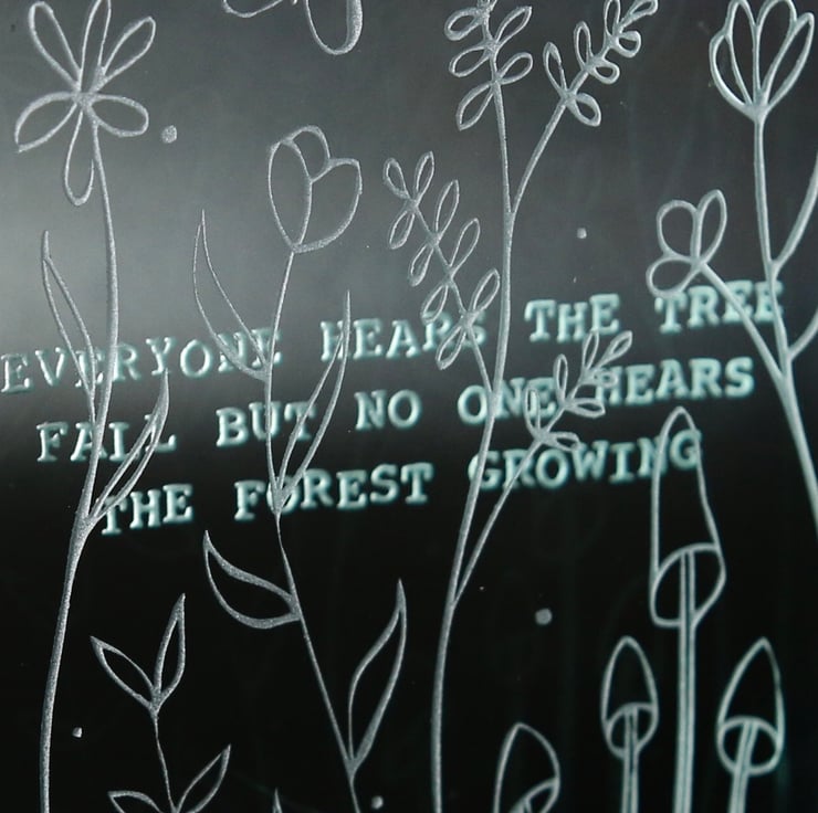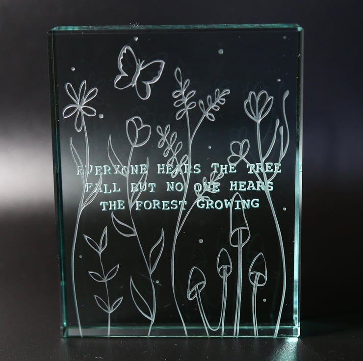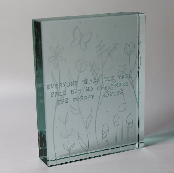 A beautiful Somalian quote, ‘Everyone hears the tree fall but no one hears the forest growing’ is deeply etched on to the back of this reassuringly thick glass block. The front of the block is sandblasted with a delicate design of plants, flowers and fungi with a butterfly floating over them to illustrate the ‘forest growing’. The sandblasting brings the light in to the block and the layering makes this a special piece that would make the perfect gift.