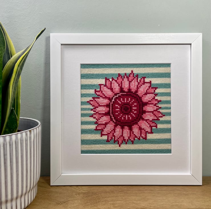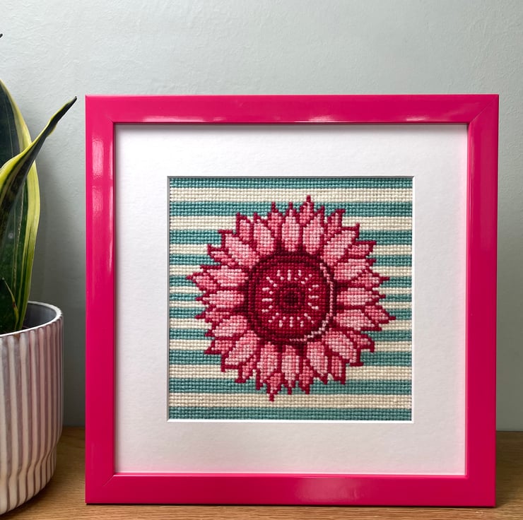 The bright pink sunflower on a green and white striped background came to life in my cross-stitch design as a celebration of my love for bold colours and playful patterns. The vivid pink adds an unexpected twist to the traditional sunflower, making it feel fun and fresh, while the striped background gives it a modern, eye-catching contrast. I love how bright colours can instantly lift a mood and turn something simple into something joyful and expressive—this piece is a perfect reflection of that.