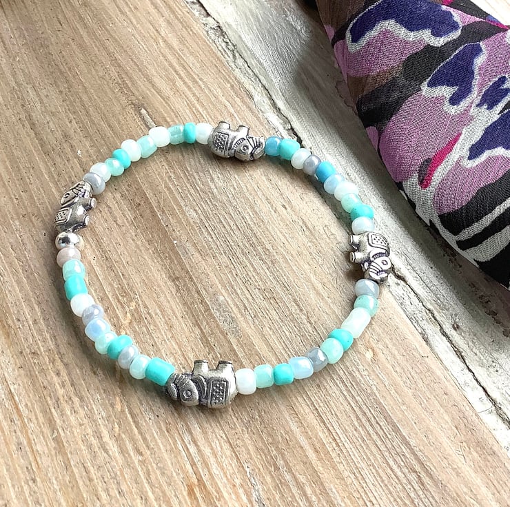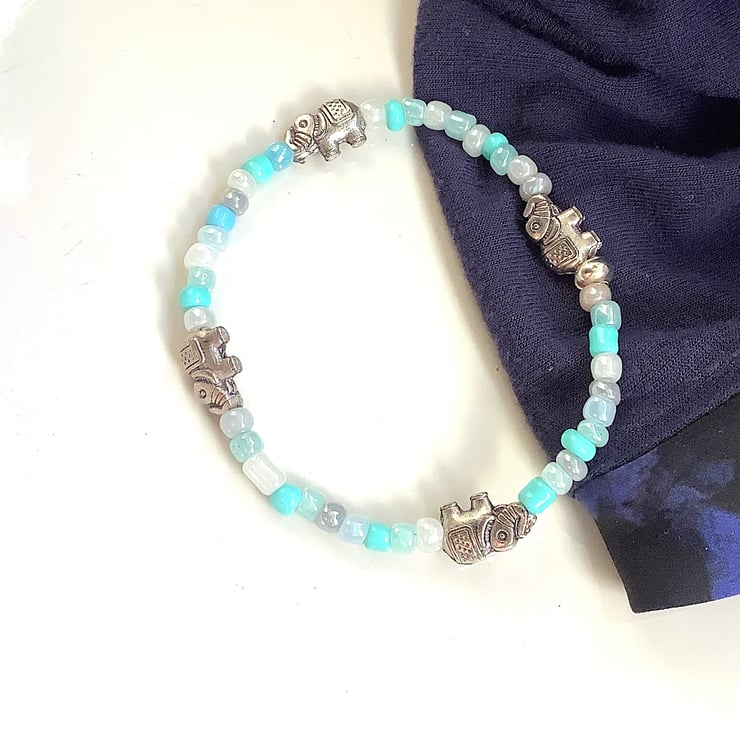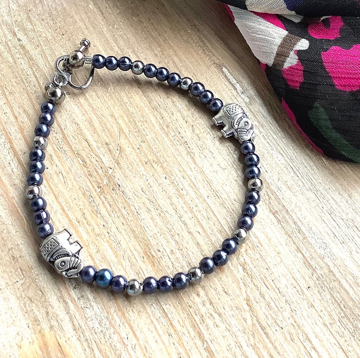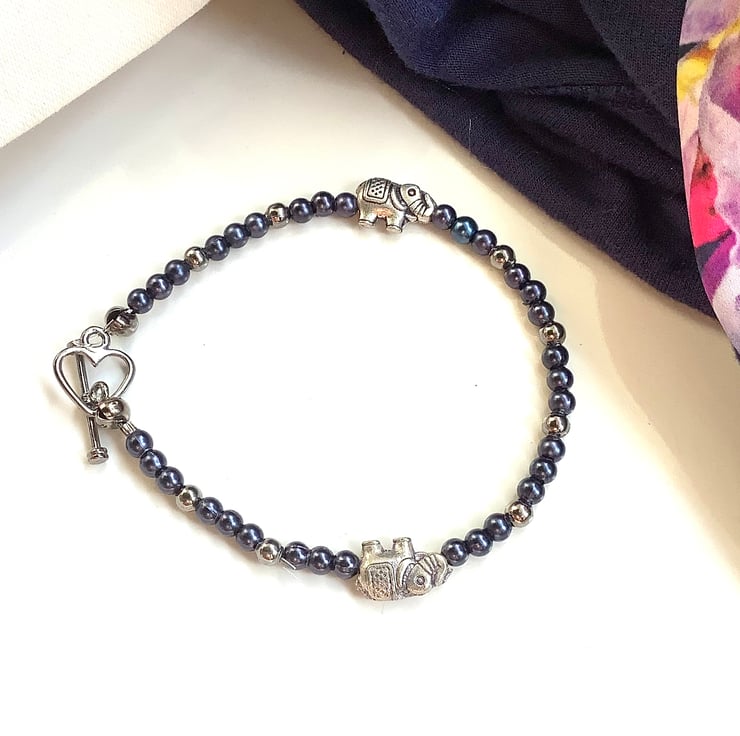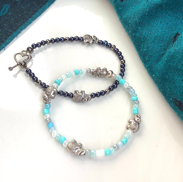 A pretty pair of friendship bracelets. Tiny elephants bring life to these bracelets. Dark blue with silver accents; Light blue with pearly accents