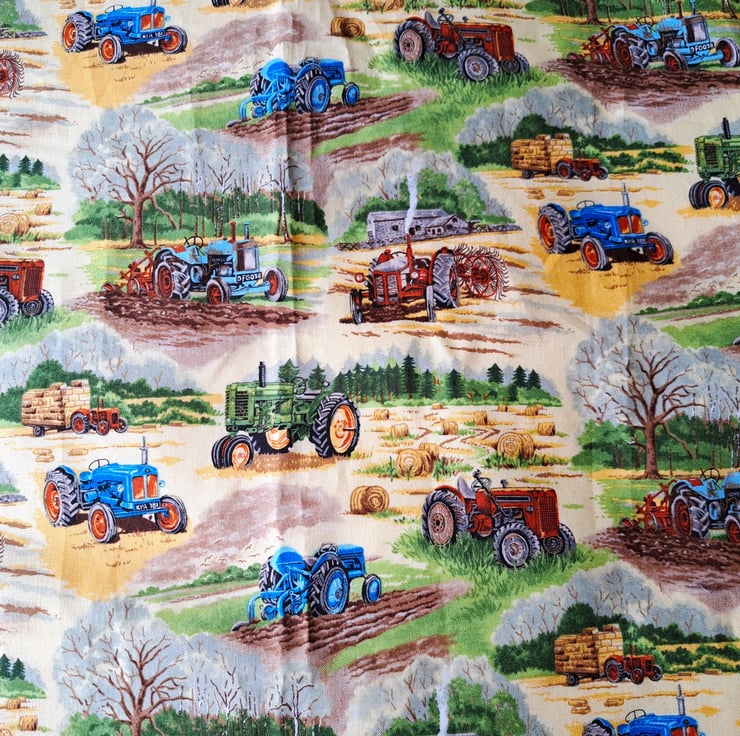 What a lovely generously proportioned cotton pinafore printed with old fashioned tractors against a farmland background. It is 23" (58cm.) wide at the hem and 30" (78cm.) long, with generous acrylic herringbone straps. I have made it of good quality quilting cotton. It can be machine washed and ironed.