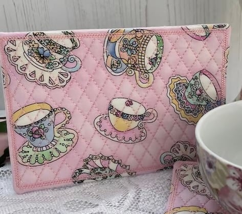 Pastel pink background with printed teacups, diamond quilting design. Lined with thermolan wadding with a pale pink backing. Measures : 6.25" x 4.25"