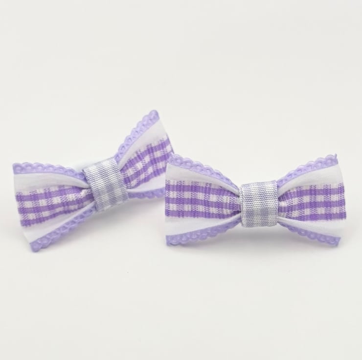 Handmade lilac gingham mini bows, set on white mini bands for a soft comfortable hold.