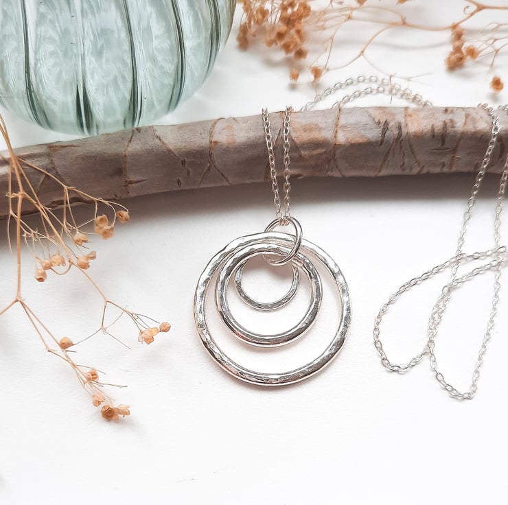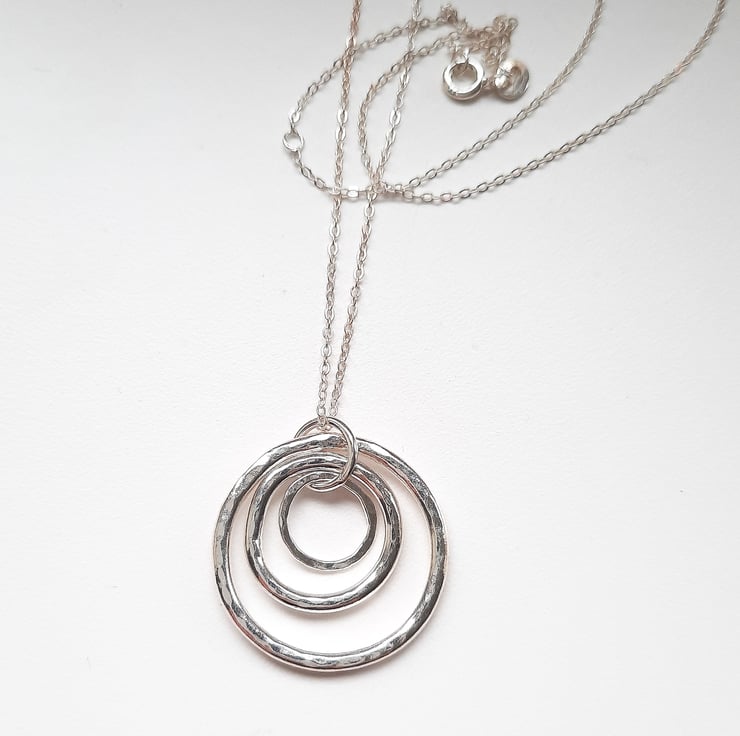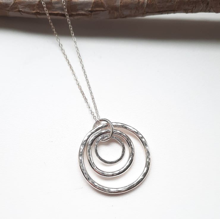 Handcrafted, fine silver 3 separate circles necklace. I have made this necklace using fine silver recycled wire, which has been hammered to give a dimpled effect. The 3 circles vary in size.