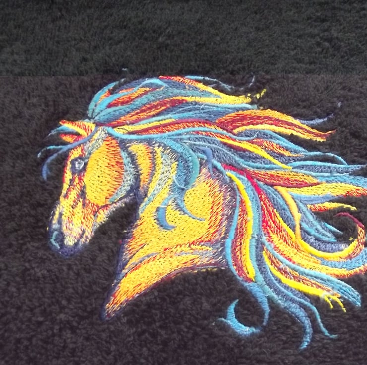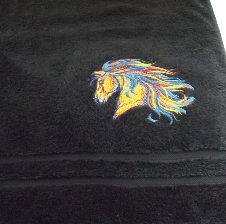 Machine Embroidered by me. Horse design machine embroidered Bath Towel. Black. Towel measures 70cm x 137cm. 100% Turkish Cotton. t17