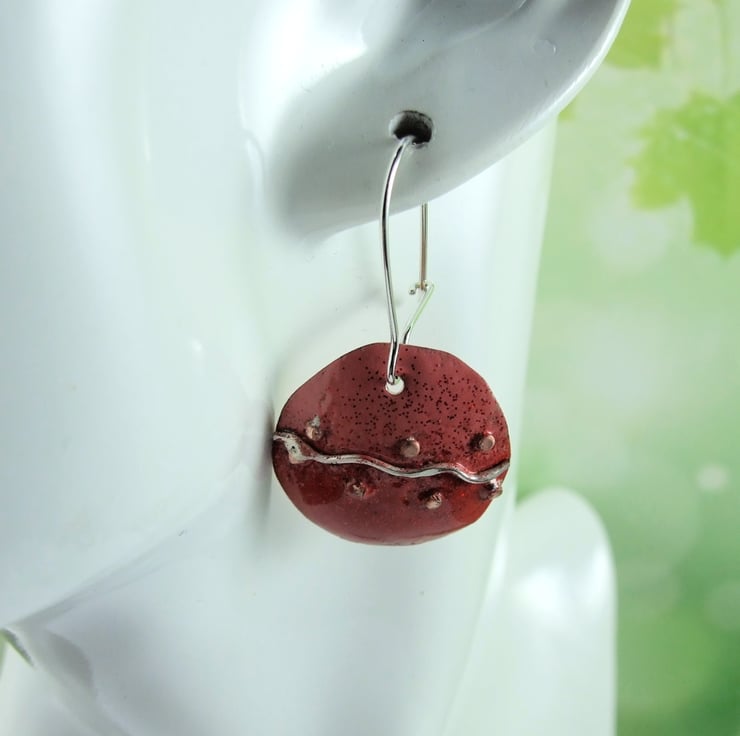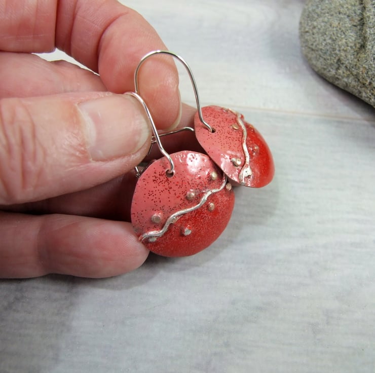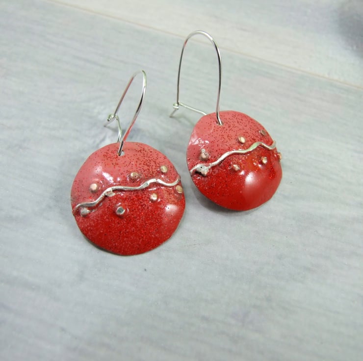Red and silver earrings. Copper with sterling silver with red and pink enamels, summer colours perfect for festivals.